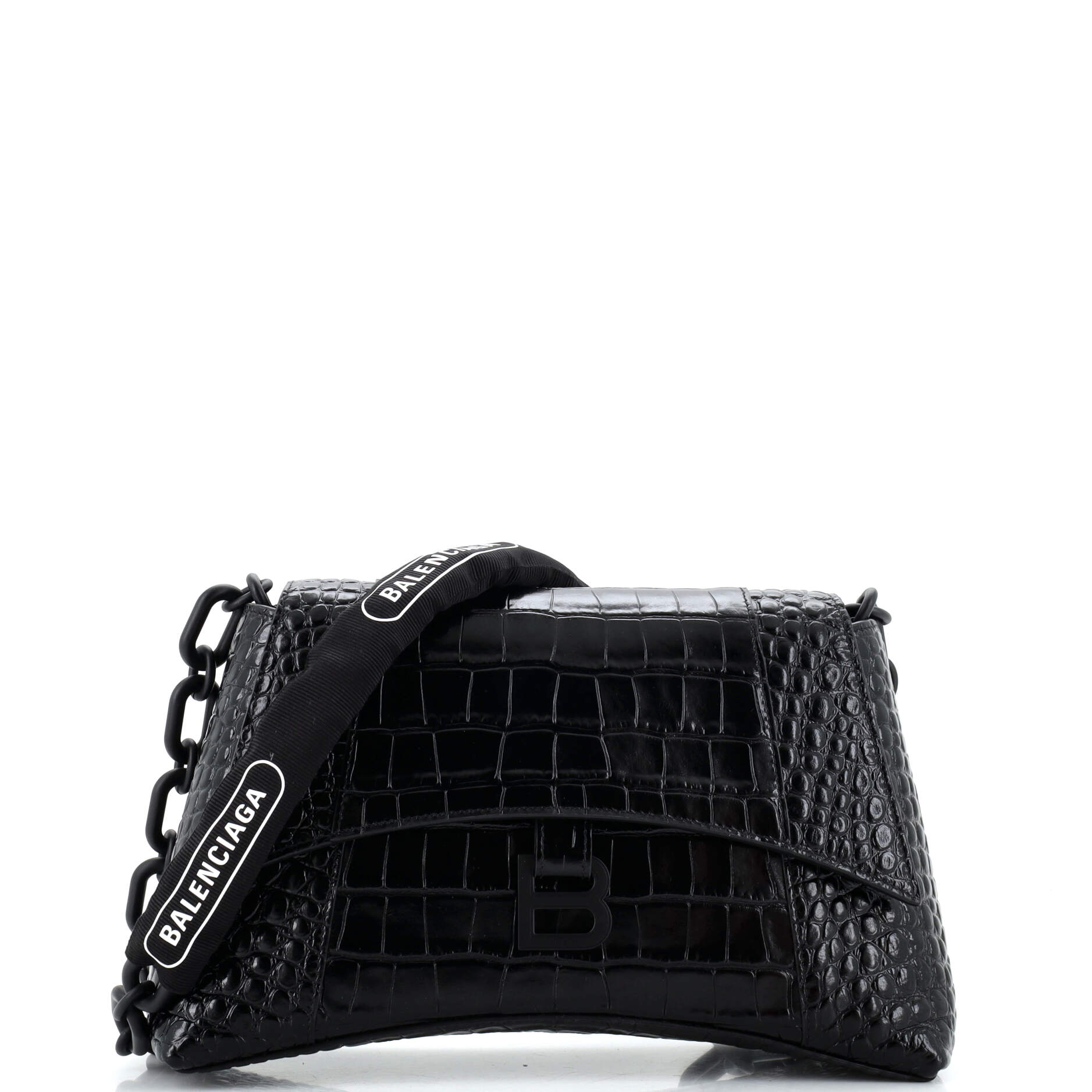 Introducing the Balenciaga Downtown S Chain-Handle Shoulder Bag. Crafted from luxurious crocodile-embossed leather, this small shoulder bag features a unique chain handle for a touch of edgy sophistication. Spacious enough to hold your daily essentials, it's the perfect accessory for the modern woman on the go.