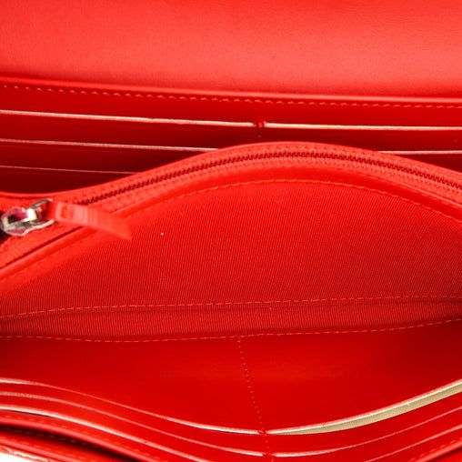 Organize your essentials in style with the Chanel CC Gusset Flap Wallet. Made with chevron patent leather, this long wallet features the iconic CC logo and a spacious interior with gusseted compartments. Keep your cards, cash, and documents secure with this stylish and functional accessory.