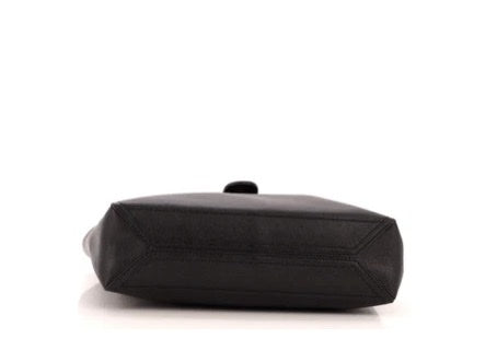 Black soft calfskin leather exterior; double flat handles; antiqued gold tone hardware; open top with central strap and magnetic dome closure to main compartment; microfibre lined interior with suede-like finish; removable matching zip pouch on hanging strap.